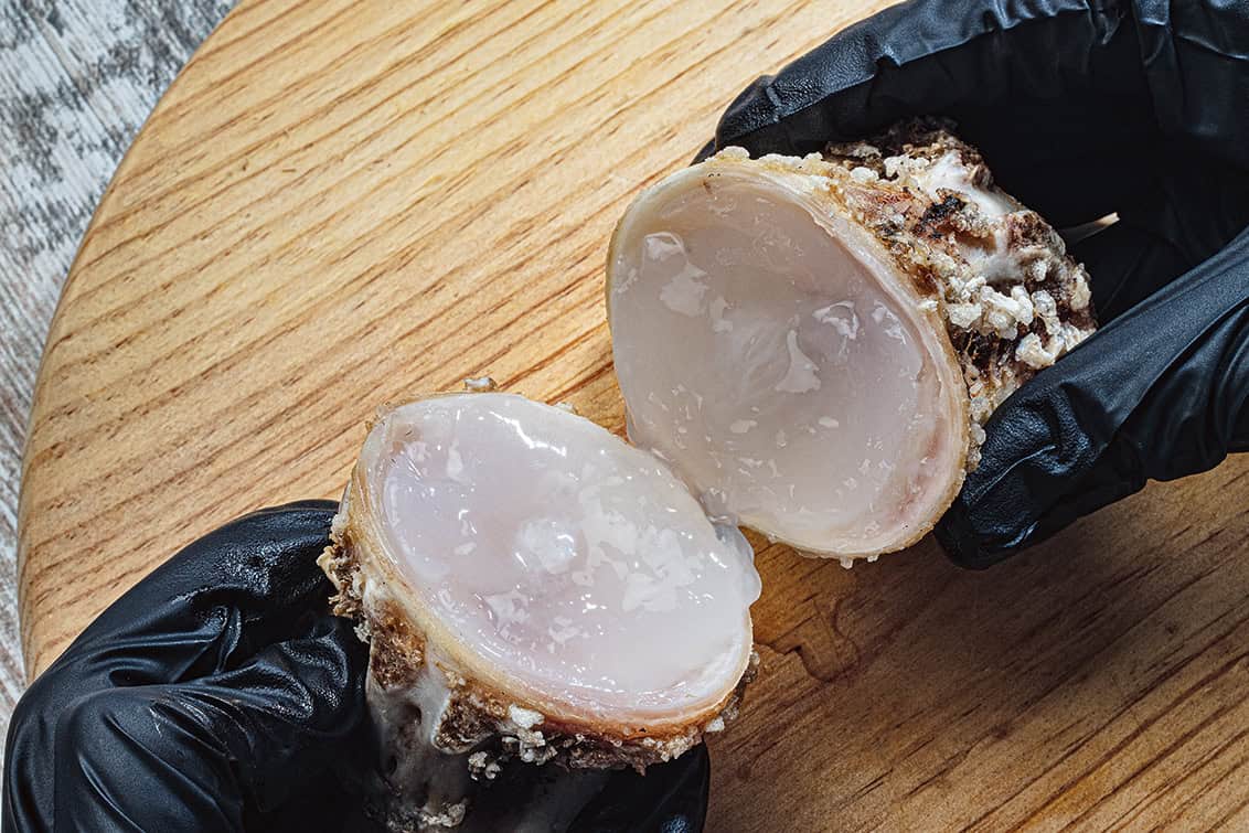 Kein Wunder auch, dass Xatruch im Disfrutar immer wieder Grenzen auslotet. Das wird auch bei einer anderen Kult-Kreation klar: der Fake-Olive. Die besteht aus einer olivenartigen Sphäre, die beim Verzehr aufplatzt und einen hochintensiven, umamiartigen Geschmack freisetzt.