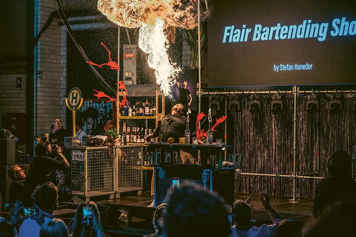 Denn: Was der neunfache Staatsmeister und Vize-Weltmeister jetzt mit seiner flammenden Flair-Bartending-Show abzieht, bringt Berlin nur dann ins Staunen und Schwitzen, wenn er die Flaschen auch sieht, mit denen er um sich wirft. Und da blendet jeder Lichtblitz. „Allen Unkenrufen zum Trotz: Flair Bartending ist noch lange nicht tot!“, ruft Haneder am Ende erschöpft und prustend. Wir glauben es ihm in Anbetracht seiner Show nur zu gerne.